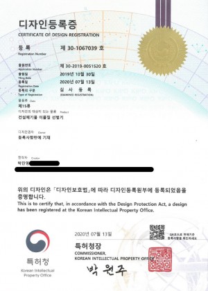 디자인등록증(건설쳬기물 이물질 선별기)-제15류